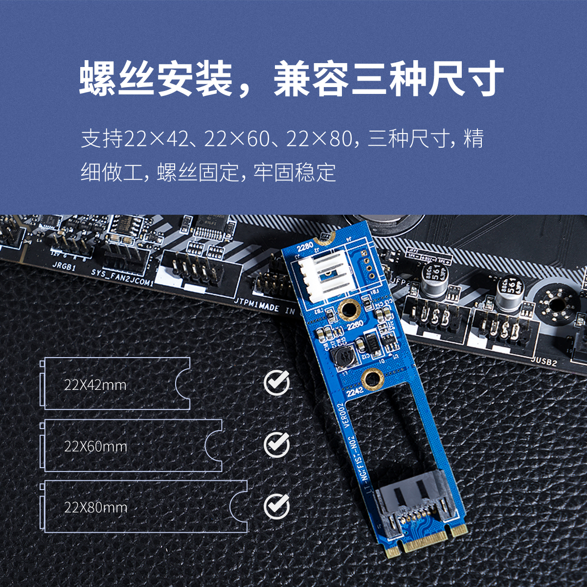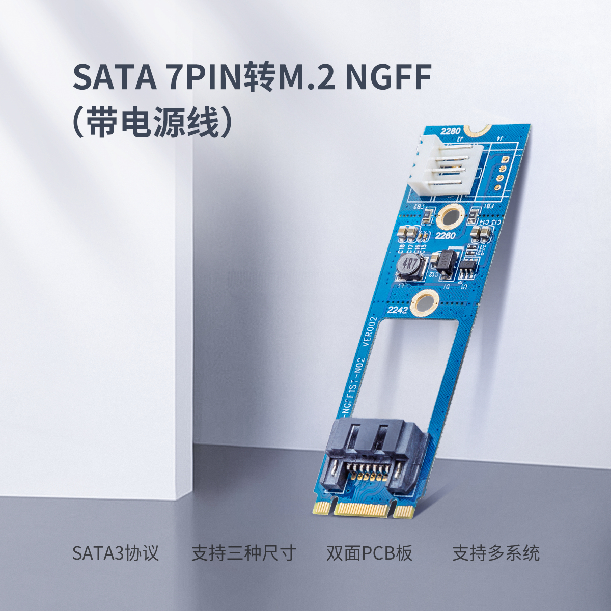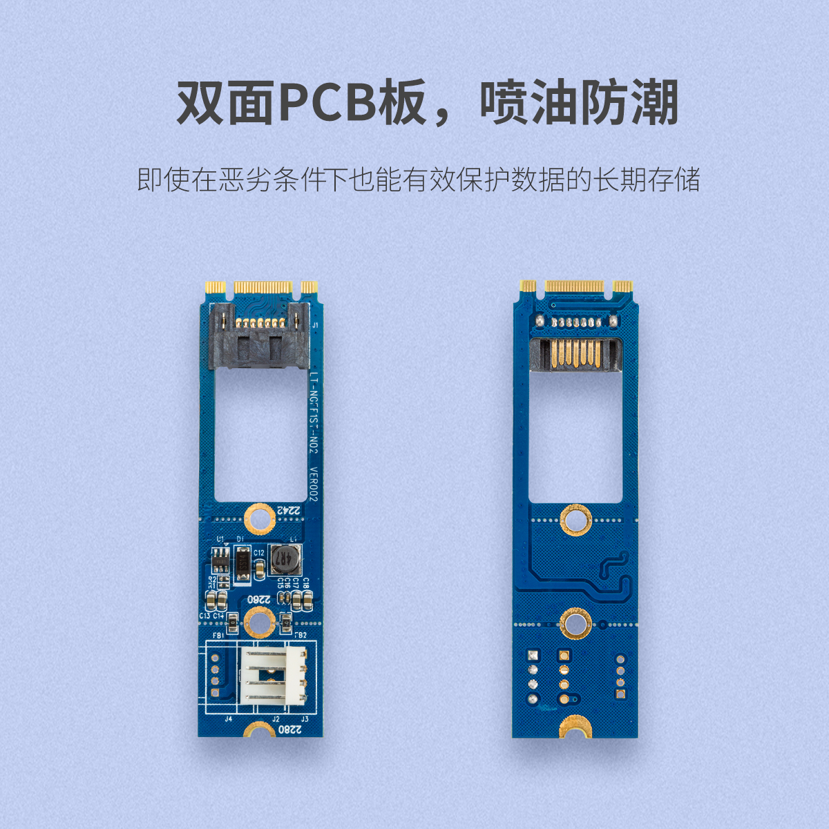 M.2 NGFF接口,支持SATA協議,支持22×42,22×60,22×80,三種尺寸,雙面PCB板,噴油防潮,多系統兼容
