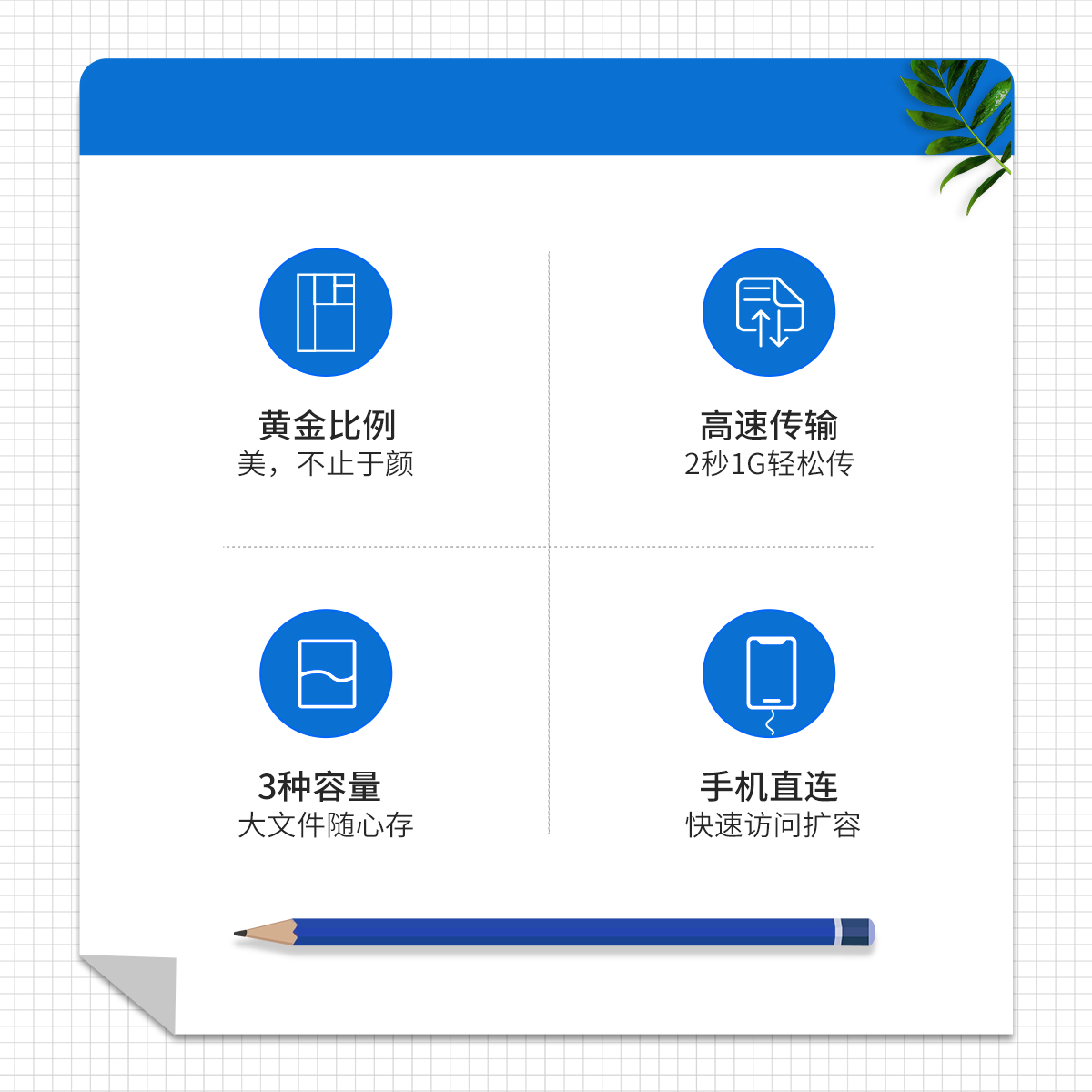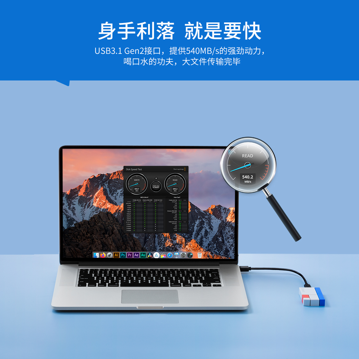 USB3.1 Gen2接口,提供540MB/s的強(qiáng)勁動力,2秒1G輕松傳,手機(jī)直連快速訪問擴(kuò)容