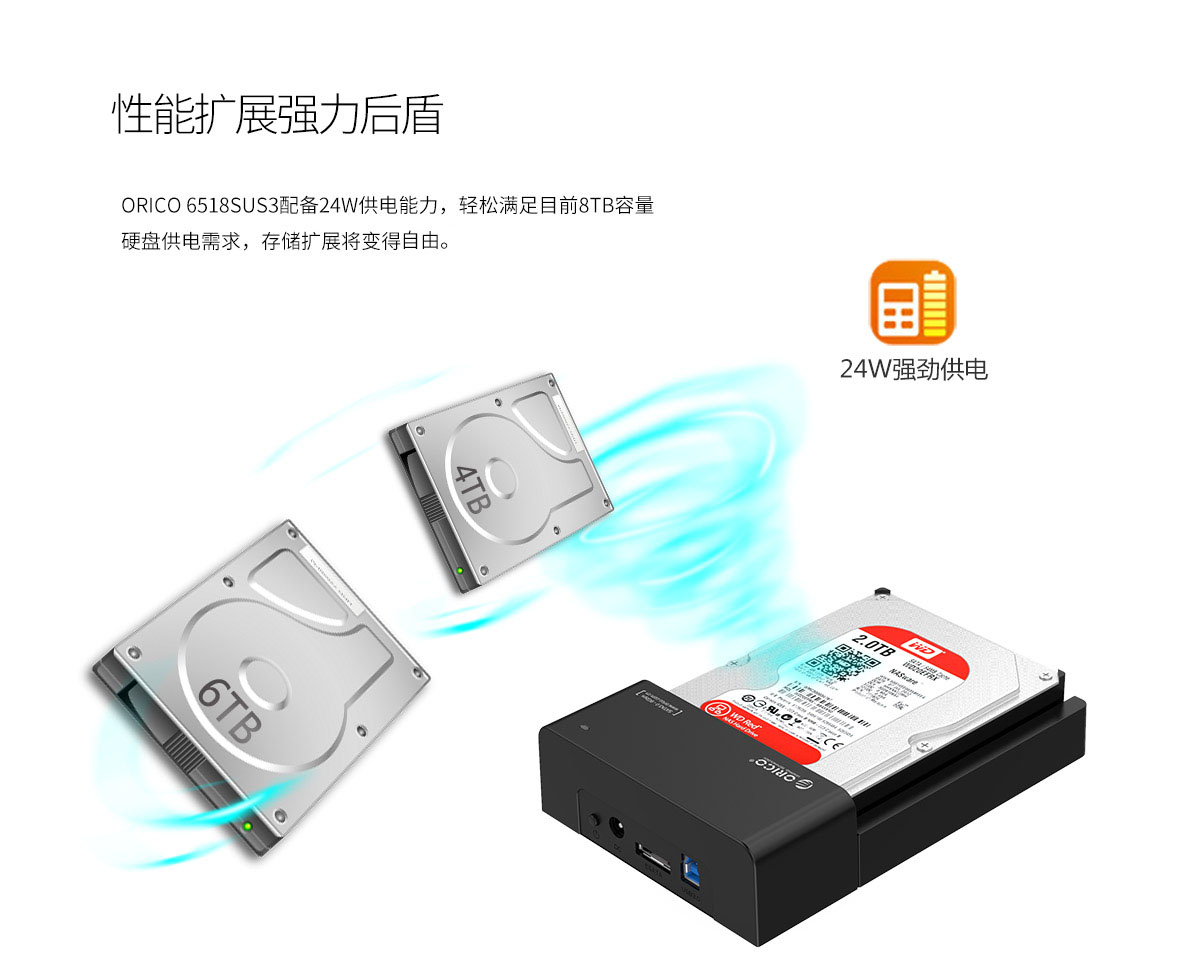 USB3.0接口,5Gbps理論速率,支持18TB大容量,24W強勁供電,開放式散熱
