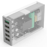 支持5臺設備同時充電,解決多人多設備充電問題,其中一個端口支持QC2.0(5V2.4A,9V2A,12V1.5A)輸出,4個端口支持5V2.4A大電流輸出,輸出總功率為5V8A/40W,一臺設備幫你打造你的桌面充電站。