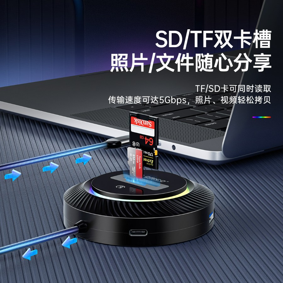 USB-A 3.0(5Gbps)*3, SD/TF3.0 *1 供電:Type-C 5V/2A 10W Max Power Port