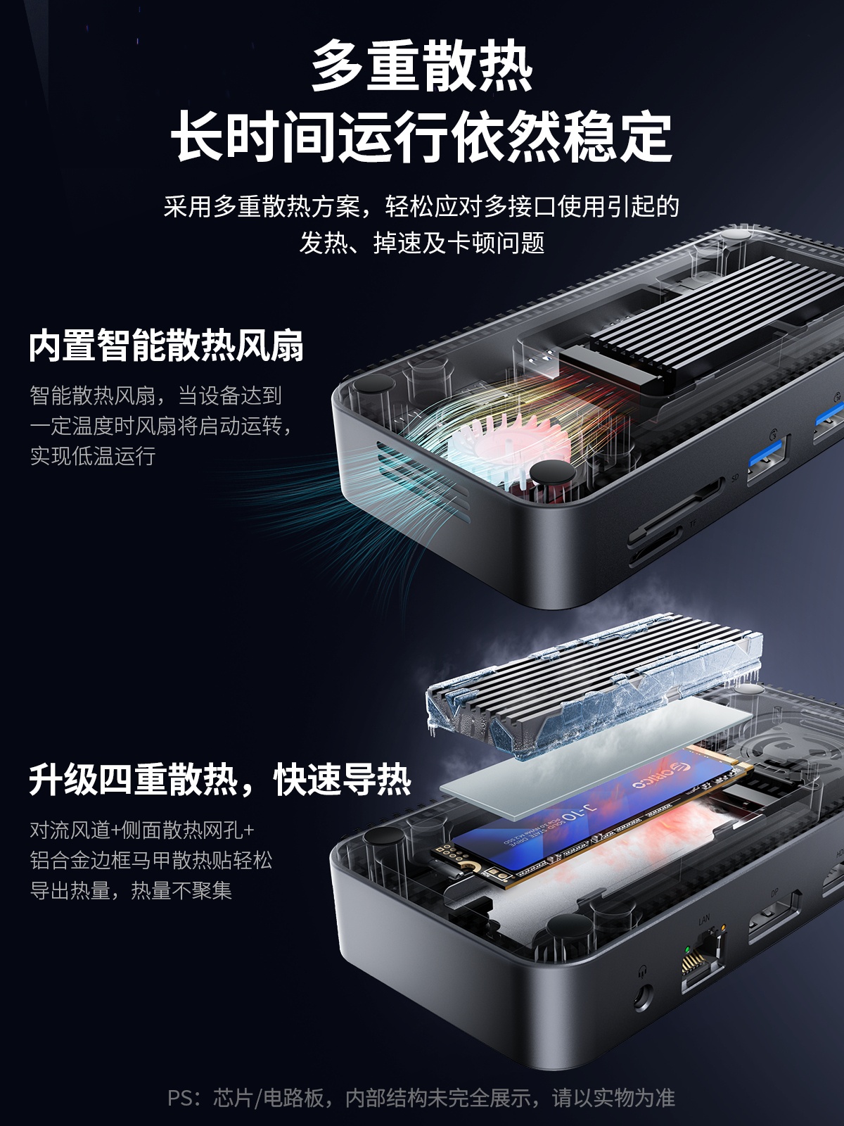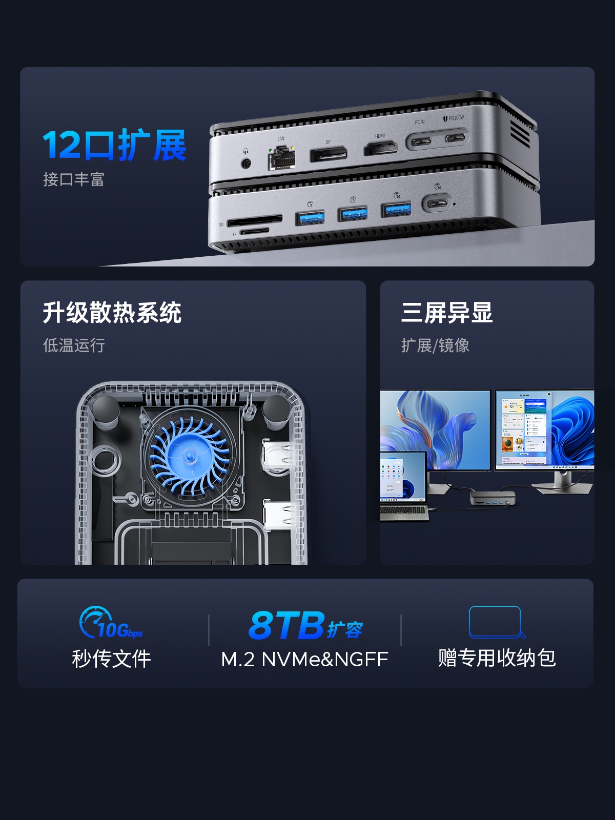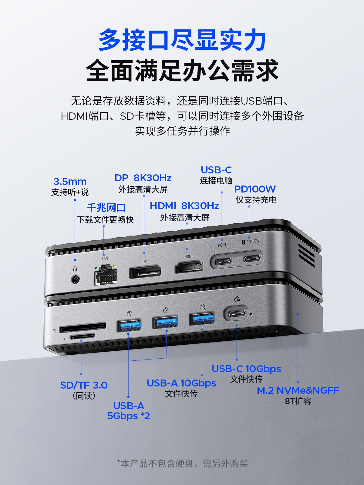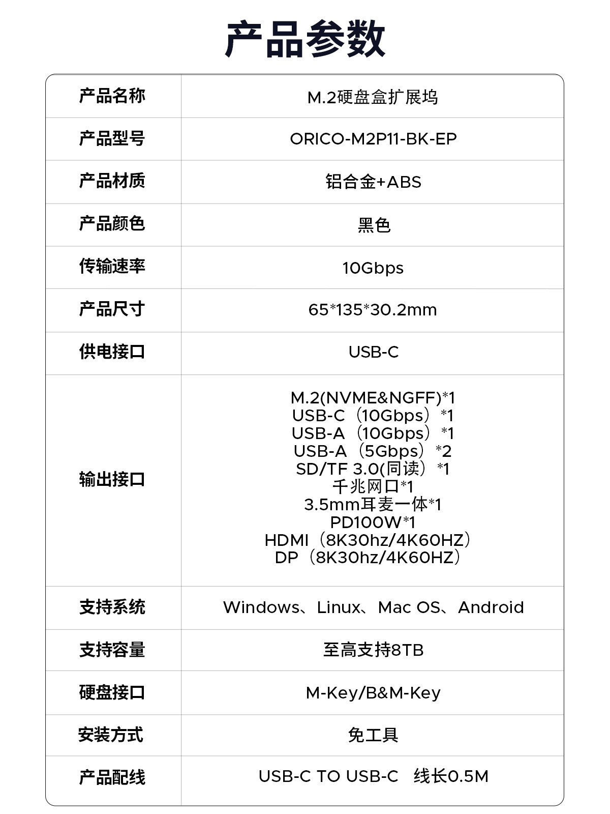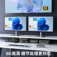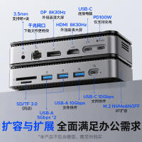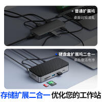 M.2(NVME&NGFF)*1、USB-C(10Gbps)*1、USB-A(10Gbps)*1、USB-A(5Gbps)*2、SD/TF 3.0(同讀)*1、RJ45(千兆)*1、3.5mm耳麥一體*1、PD100W*1、HDMI(8K30hz/4K60HZ)、DP(8K30hz/4K60HZ)最高支持倆個視頻信號,單顯可達(dá)8K30HZ,同顯可達(dá)4K60HZ
