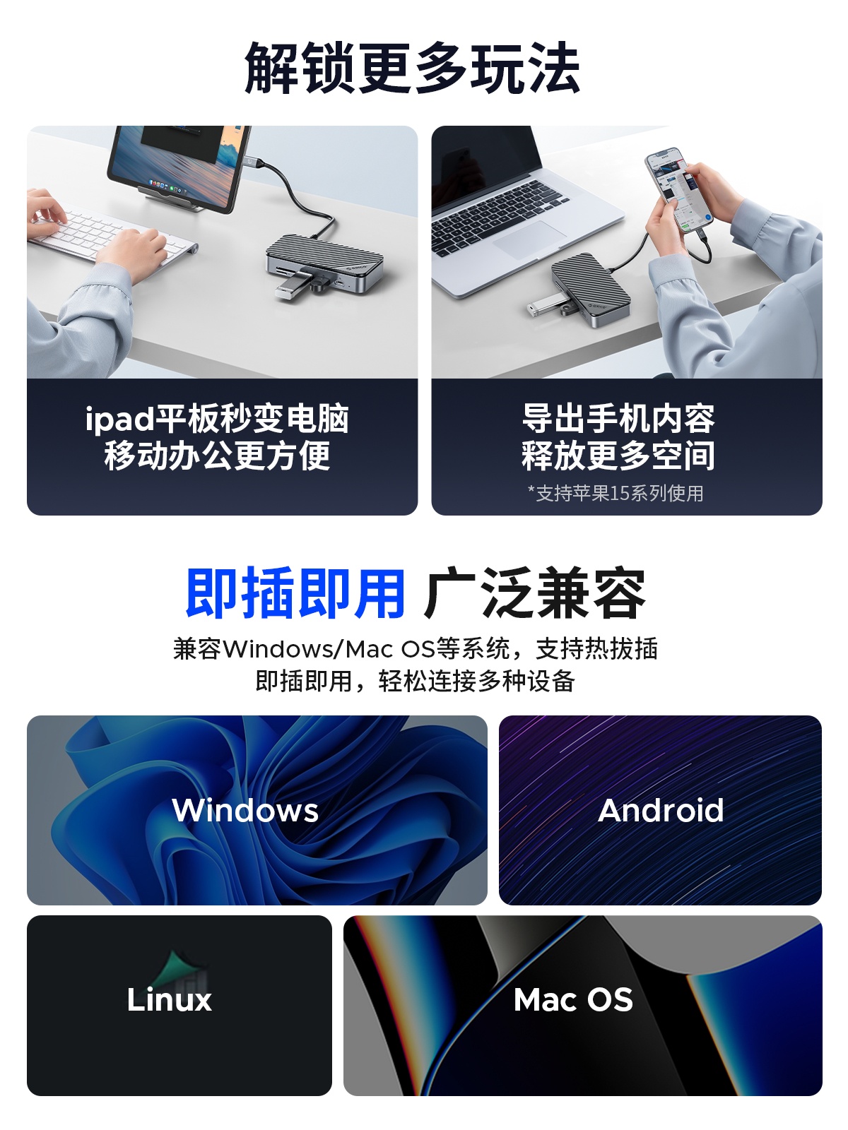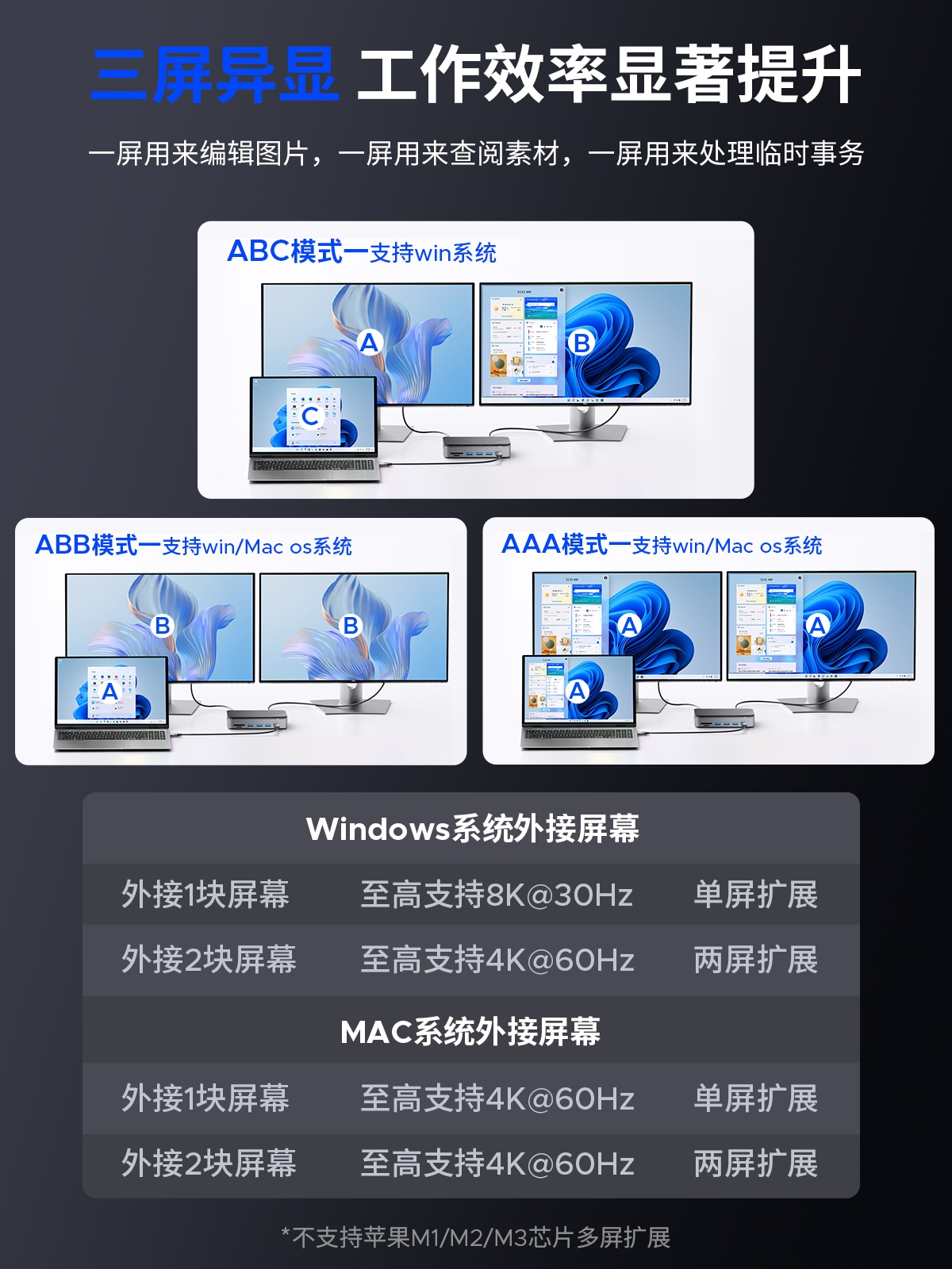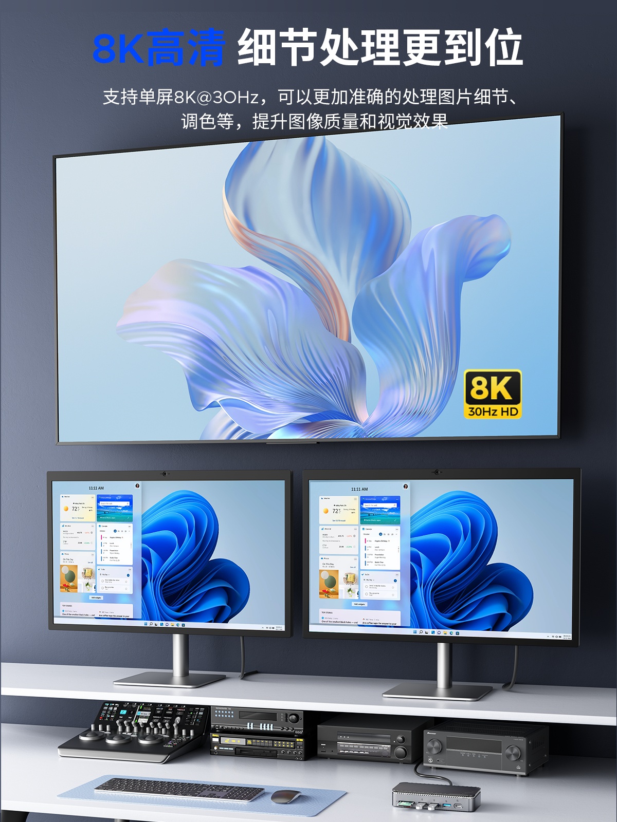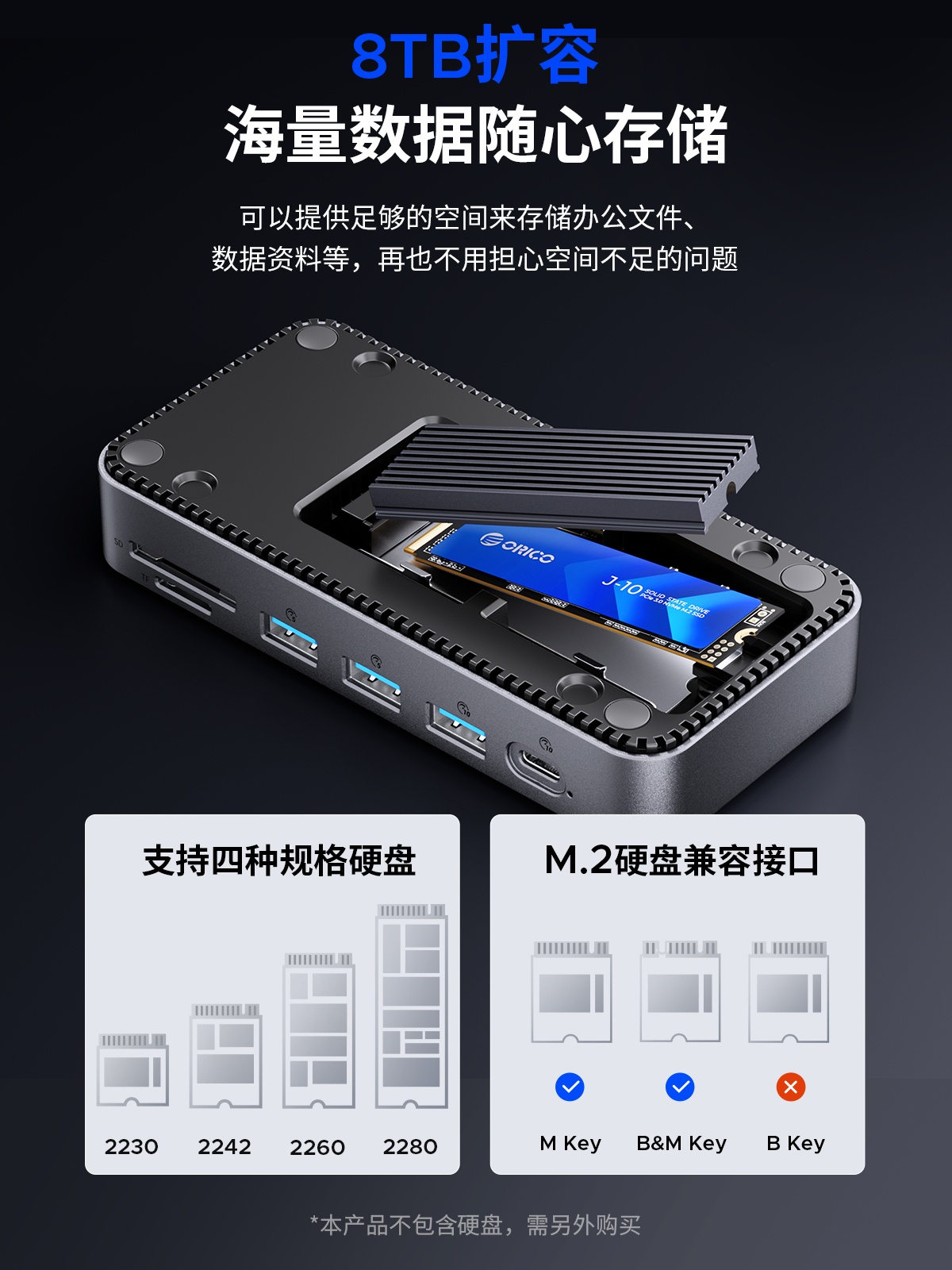 M.2(NVME&NGFF)*1、USB-C(10Gbps)*1、USB-A(10Gbps)*1、USB-A(5Gbps)*2、SD/TF 3.0(同讀)*1、RJ45(千兆)*1、3.5mm耳麥一體*1、PD100W*1、HDMI(8K30hz/4K60HZ)、DP(8K30hz/4K60HZ)最高支持倆個視頻信號,單顯可達(dá)8K30HZ,同顯可達(dá)4K60HZ