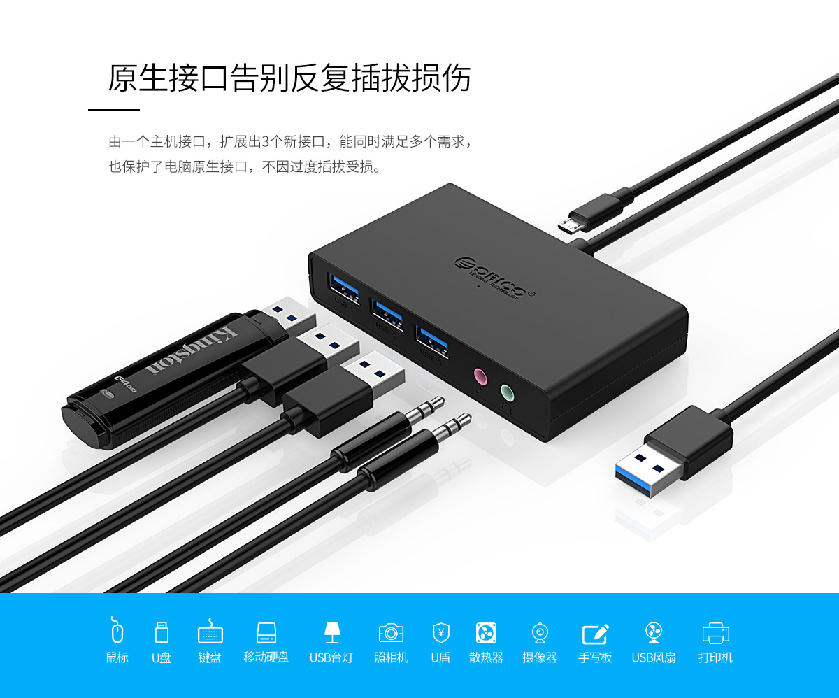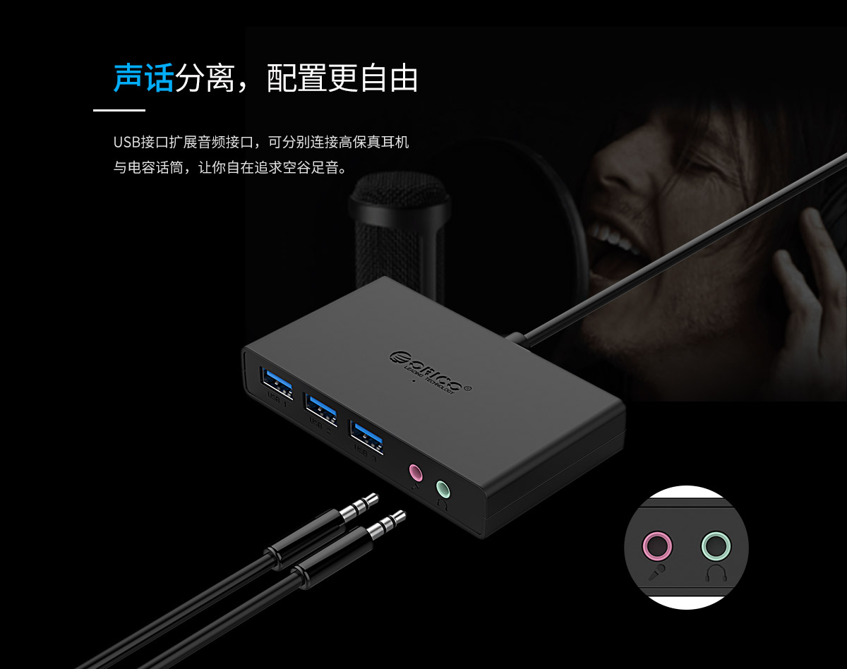 3口USB3.0擴展 連體設計 帶音頻和麥克風接口 多種可選線長