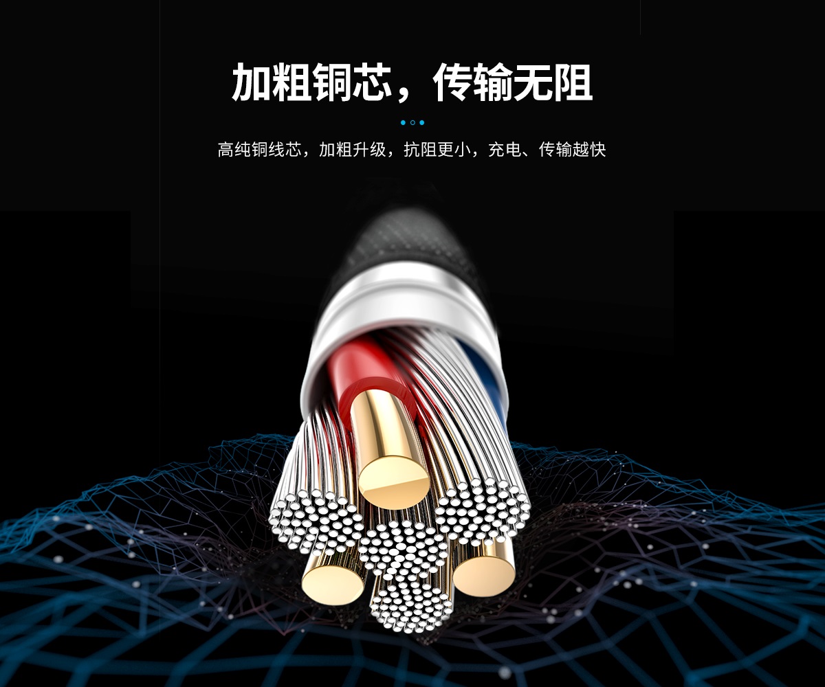 高純銅線芯,加粗升級,抗阻更小,充電、傳輸越快