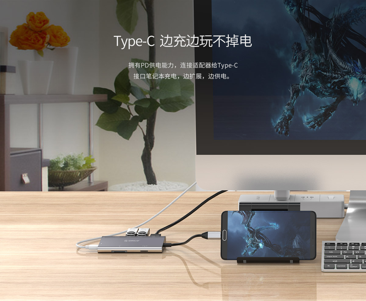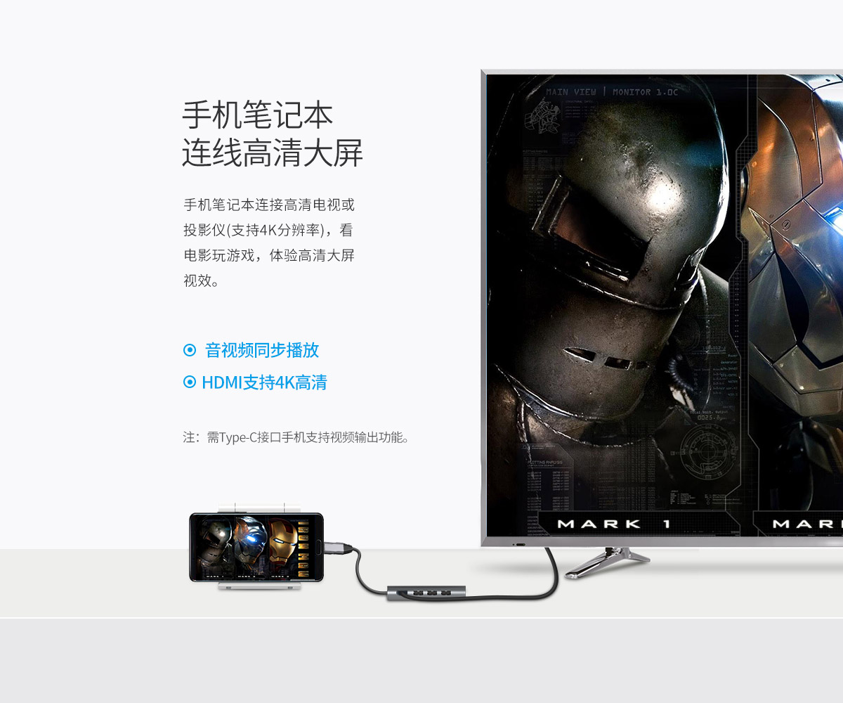 TYPE-C接口接適配器給主機(jī)充電支持USB PD:5-20V,3A,60W max; 音視頻支持同步播放 ,HDMI 最大分辨率可支持4K@30Hz RJ45網(wǎng)卡口自適應(yīng)10/100/1000Mbps