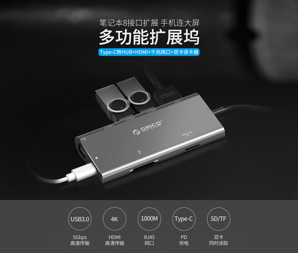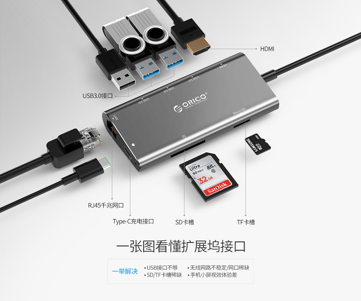 鋁合金外殼 高清視頻接口擴(kuò)展 多接口多功能擴(kuò)展 連體數(shù)據(jù)線設(shè)計(jì) 千兆網(wǎng)口擴(kuò)展