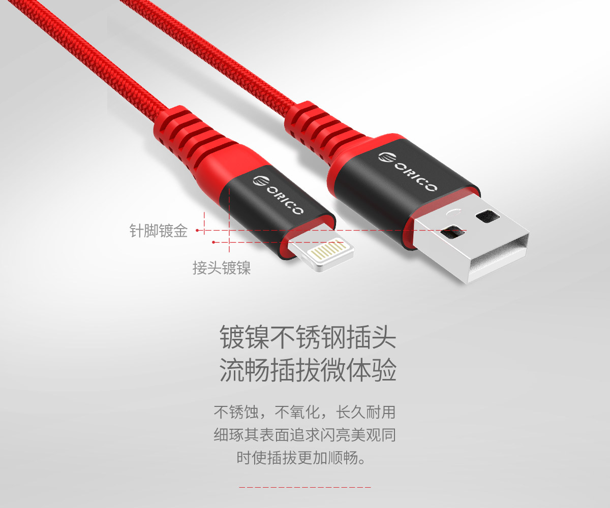 紅色芳綸纖維編織,2.4A大電流,鍍鎳不銹鋼插頭,粗鍍錫高純度銅芯
