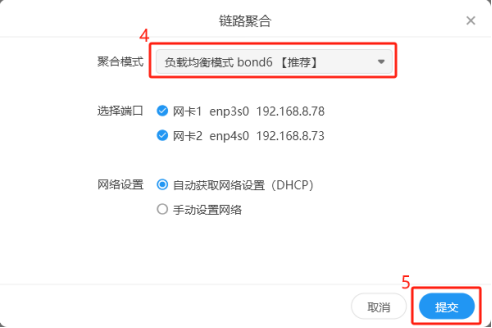 2.選擇鏈路聚合模式,如 負載均衡-Bond6;